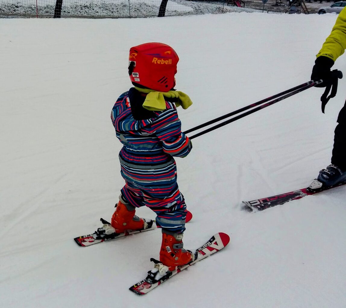 - Pradedantiesiems: Vaikas dar tik mokosi stovėti ant slidžių ar čiuožia „picos“ (plūgo) pozicija.